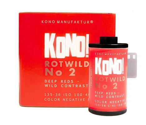 KONO ROTWILD No. 2 ISO 100–400/36. Redscale tipo juostelė, kuri suteikia nuotraukoms šiltus, raudonai oranžinius tonus. 36 kadrai, C-41 procesas. KONO! juosteles galima ryškinti bet kurioje fotolaboratorijoje.