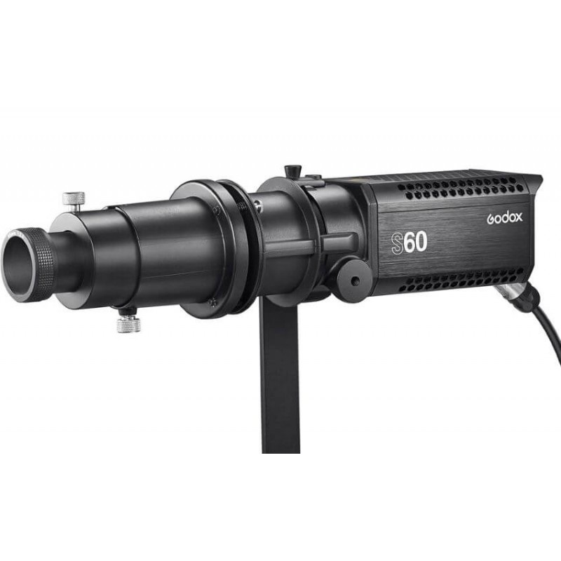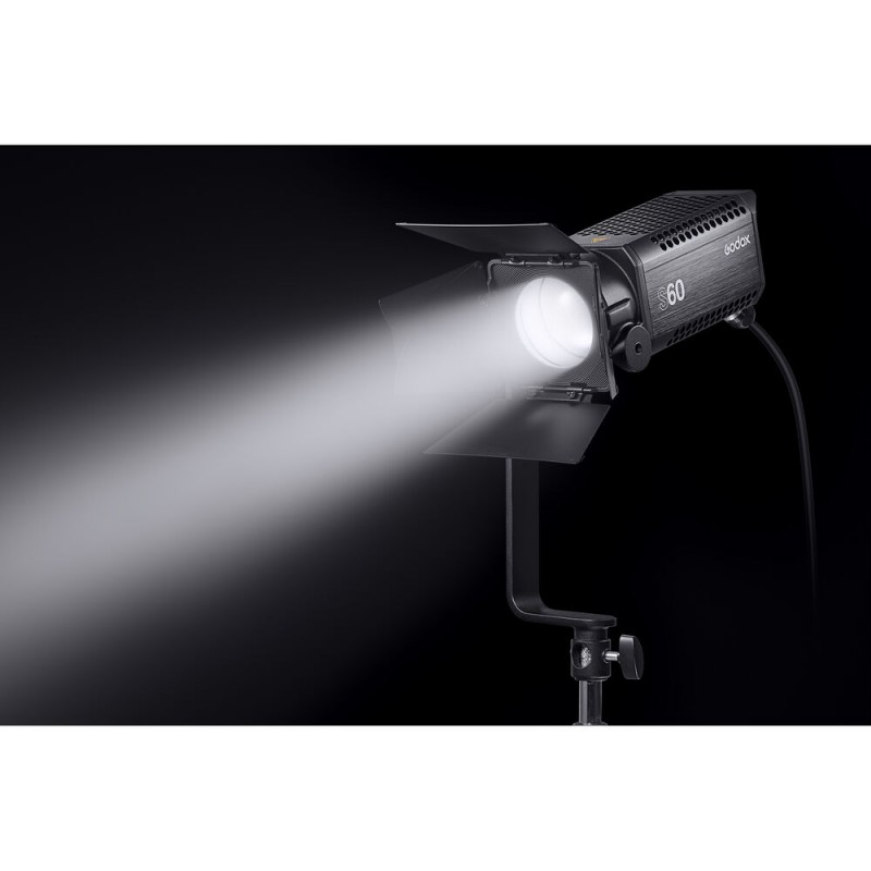 S60Use this S60 LED Focusing Light from Godox for when you require variable beam focus backed by control and power options. The light has an expansive focusable beam spread of 6 to 55 degrees so you can use it as an accent light, a hair light, a long throw fixture, or a selective lighting tool. At 55 degrees it is easy to fill a silk or light a group. The included barndoors allow you to further shape the light.