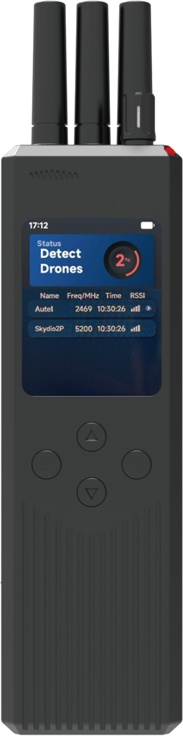 - Advanced Detection: Detects and identifies a wide range of drone models (DJI series, FPVs, Xiaomi, Yuneec, Hubsan, Powervision, Tello, Autel) across multiple frequency bands (900MHz, 1.1GHz, 1.2GHz, 1.4GHz, 2.4GHz, 5.2GHz, 5.8GHz).