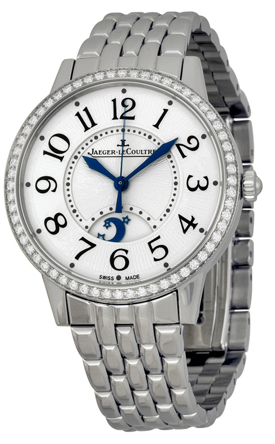 Item Number: Q3448120 Brand Name: Jaeger-LeCoultre Style Number: Q3448120 Also Called: 3448120, Q344.81.20, 344.81.20 Series: Rendez-Vous Night & Day 34mm Style (Gender): Ladies Case Material: Stainless steel Case Shape: Round Dial Color: Silver sunburst with black Arabic numerals Movement: Mechanical Automatic Engine: Jaeger Calibre 898A ( 28,800 vph) Number of Jewels: 30 Functions: Hours, Minutes, Seconds, Day/Night Display Crystal Material: Anti reflective Sapphire Case Diameter: 34.0 mm Case Thickness: 8.8 mm Caseback: Sapphire Crystal - Transparent Exhibition Back revealing rotor Bezel Material: Stainless Steel set with 60 diamonds Bezel Function: Fixed Water Resistance: 50m / 165ft ( suitable for very light splashing; unsuitable for rain, showering, swimming or diving) Crown Material: Stainless Steel, Fluted crown Power Reserve: 43-hour power reserve Watch Bracelet / Strap Material: Polished Stainless Steel Watch Clasp Material: Deployant First Production Year: 2012