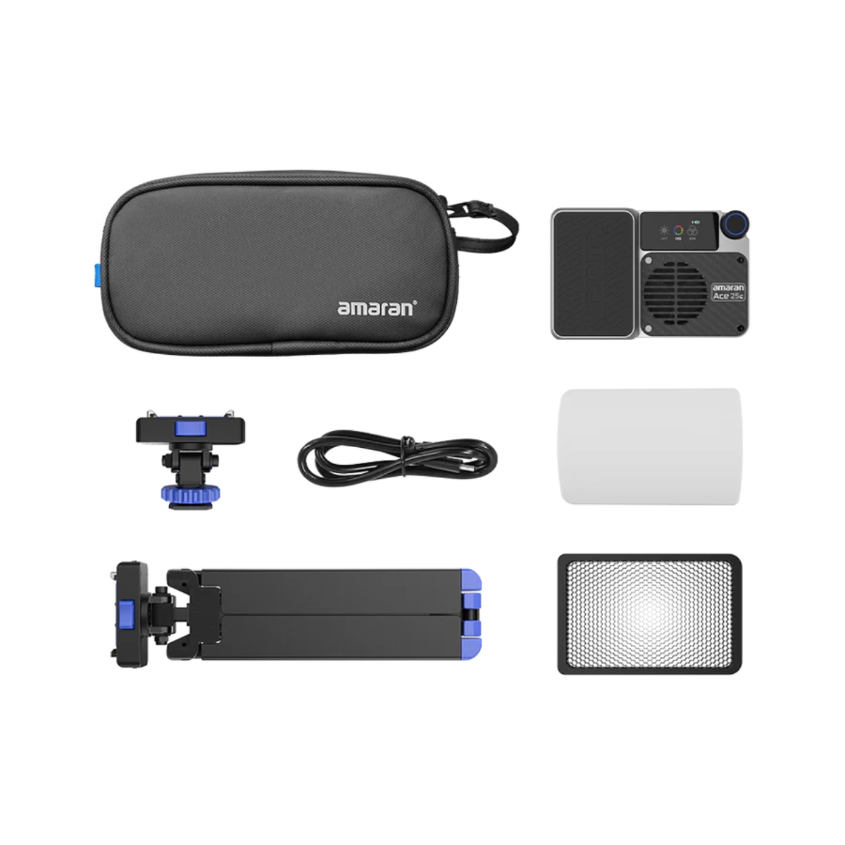 Amaran Ace 25c Kit Silver - iki 32 W galios spalvotas kompaktiškas LED šviestuvas, skirtas keliaujantiems kūrėjams, norintiems neribotai valdyti spalvas bet kokioje situacijoje. Turėdama greito nuėmimo laikiklį „amaran Ace Lock“ ir dvigubai didesnį ryškumą, baterijos veikimo laiką ir įkrovimo greitį nei kitos panašios kišeninės lemputės, „amaran Ace 25c“ yra puikiai ryški, bet kompaktiška lemputė, pasiruošusi suteikti jūsų turiniui tobulą atspalvį. Pakuotės turinys: 1x amaran Ace 25c, 1x amaran Ace Dome difozorius, 1x amaran Ace 30° šviesos valdymo tinklelis, 1x amaran Ace Lock adapteris, 1x amaran Ace Lock mini trikojis, 1x amaran USB-C įkrovimo laidas (50 cm), 1x 5mm šešiakampis raktas, 1x amaran Ace krepšys.