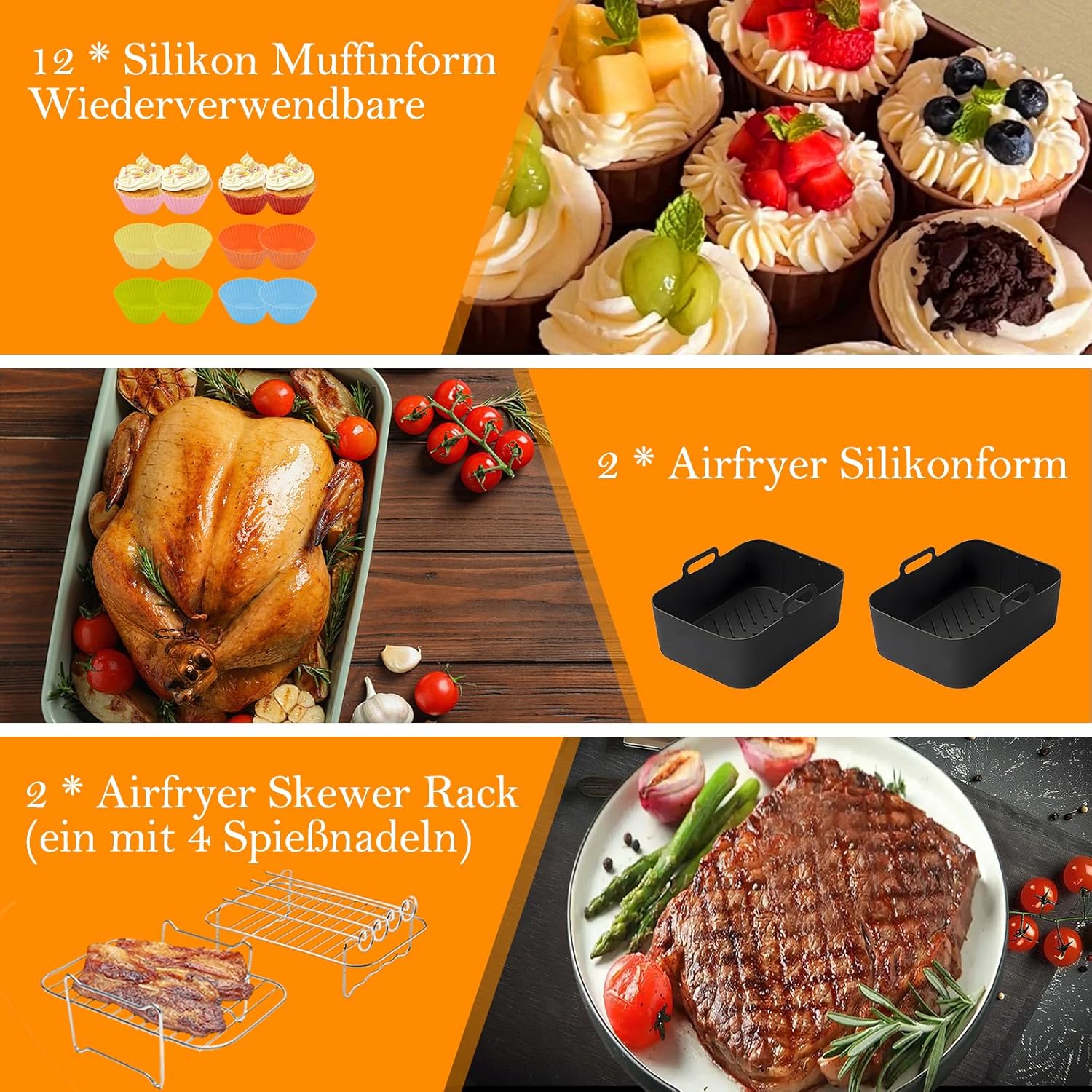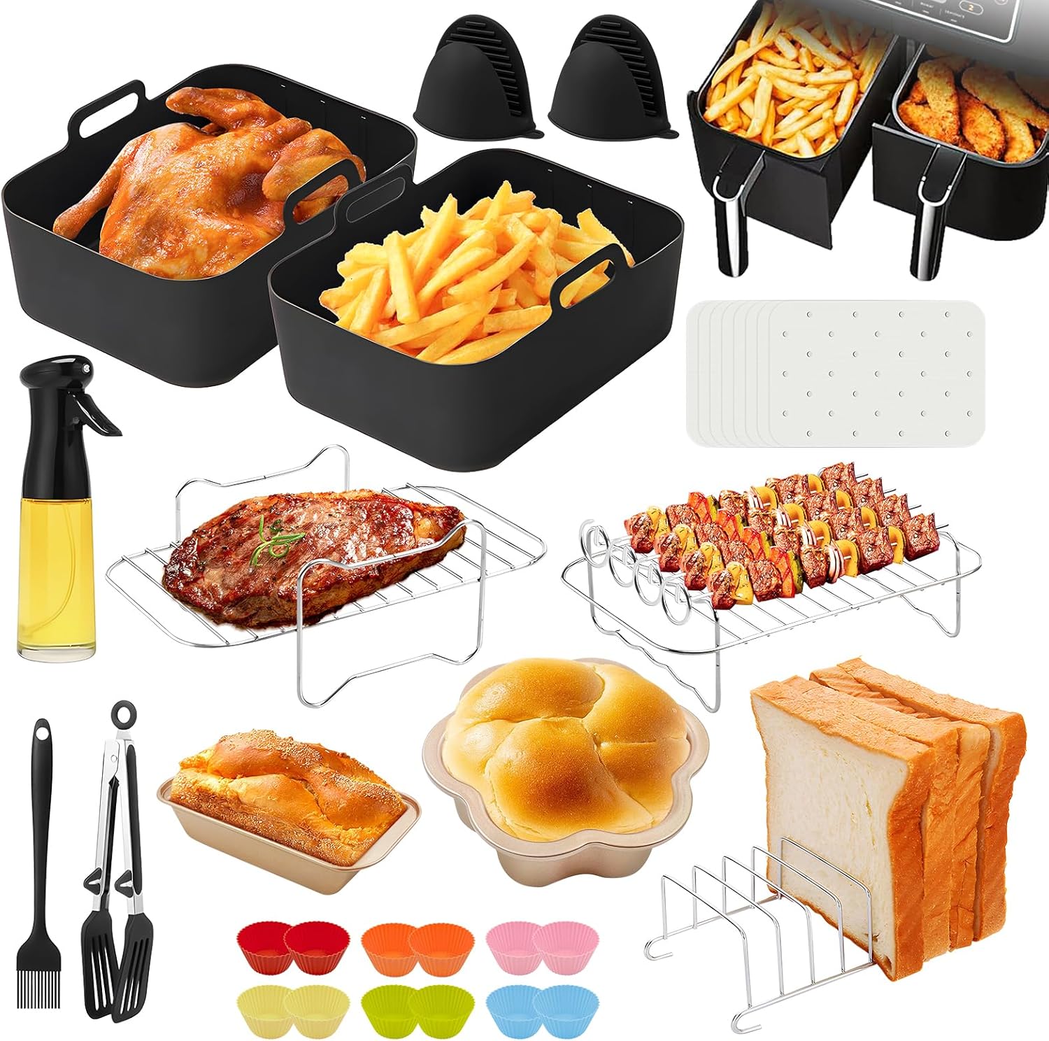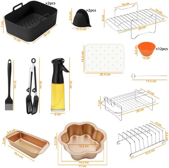 2 air fryer silicone moulds, 1 oil sprayer, 2 bread baking moulds, 2 airfryer skewer rack, 1 toast stand, 12 silicone muffin moulds, 1 pair of thick silicone oven gloves, 1 baking brush, 1 silicone cooking tongs and 100 sheets of baking paper white