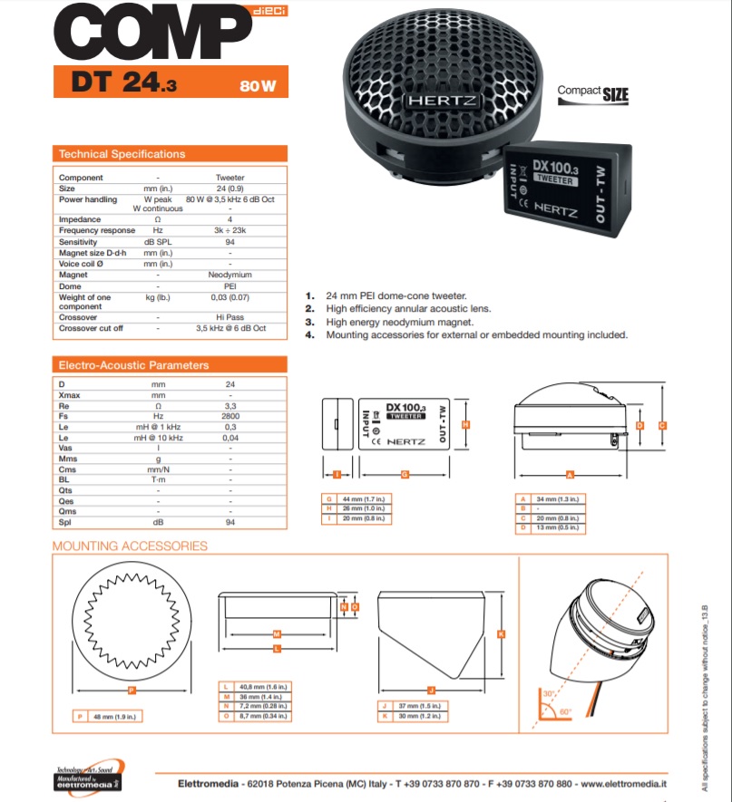 The optimized structure of the neodymium tweeter offers high efficiency and linear, extended frequency response unheard of in this category. The DT 24 car audio tweeters optimized geometry boasts an efficient, highly linear annular acoustic lens along with a PEI membrane, selected for its high stiffness and heat-resistance. These design solutions provide the best damping with a detailed, linear sound, even at high SPL levels. Its installation is universal thanks to the supplied brackets allowing both surface mount and flush mount applications.