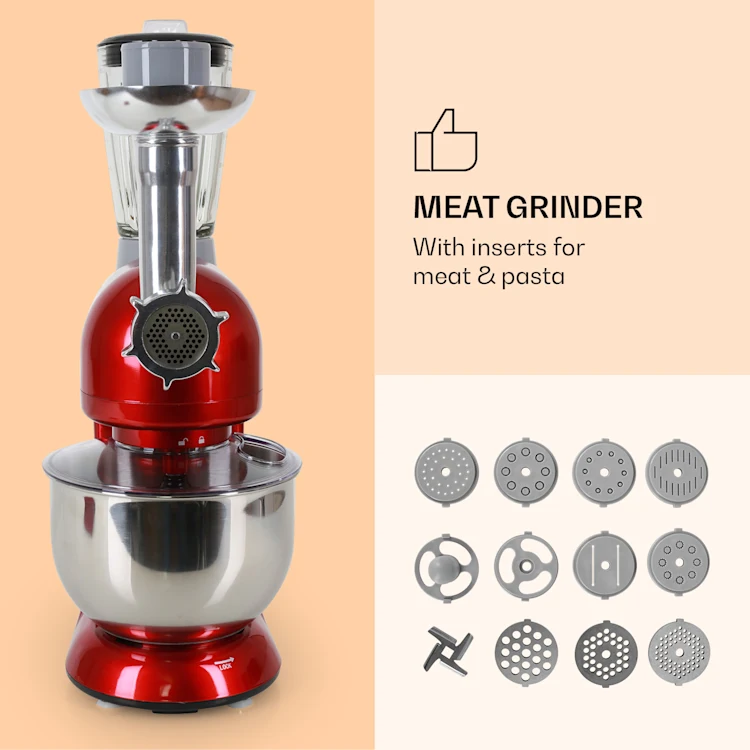 You can create fresh smoothies and delicious shakes in the 1.5-litre blender attachment. And for fans of fresh minced meat or pasta, the stainless steel meat grinder attachment is the perfect addition. The colourful design of your new Bella is equally impressive. This way, it is also the highlight in your kitchen after use!