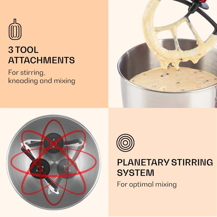 - 3 stirring elements: dough hook / stirring hook / whisk