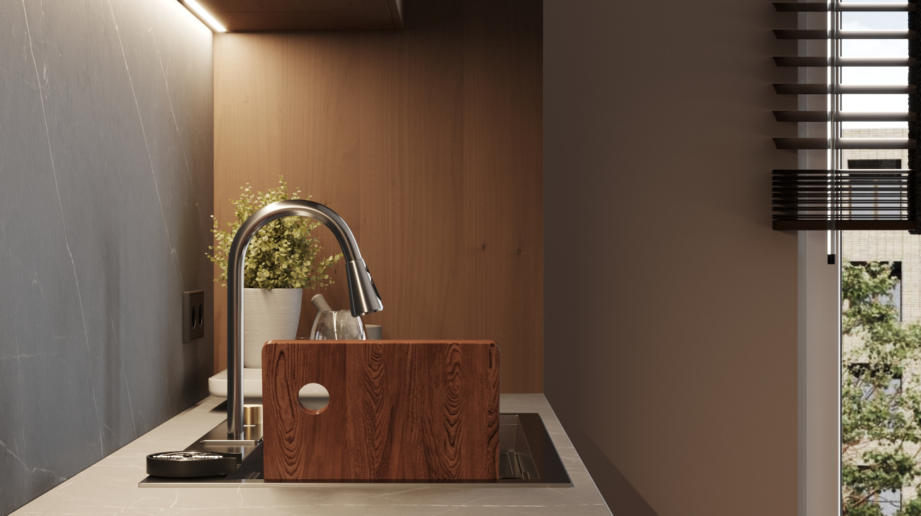 Koka dēlītis, kas iebūvēts izlietnē, ļaus vienlaicīgi gan griezt produktus, gan tos noskalot.