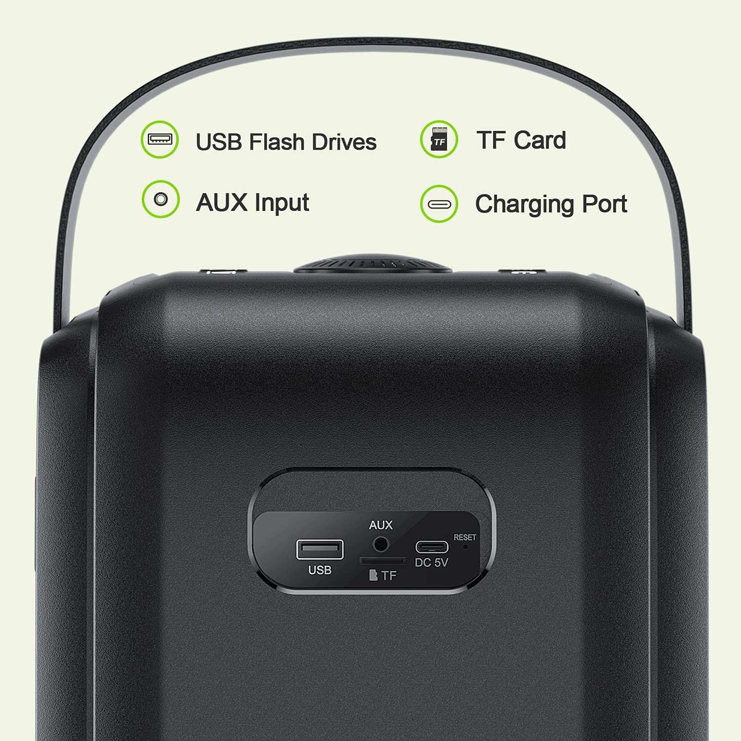 TF Card Slot: Enjoy a treasure trove of private music at any time, meeting the quality of party life AUX Slot (3.5mm Audio jack): AUX external audio, party DJ equipment can also be closely connected, audio and video synchronization, 18ms ultra-low delay playback, strong electromagnetic anti-interference ability, and can avoid external electronic signal noise. USB Slot (USB flash drive): Enjoy your personal collection at any time without worrying about losing your chance to rock music because you don't have an internet connection