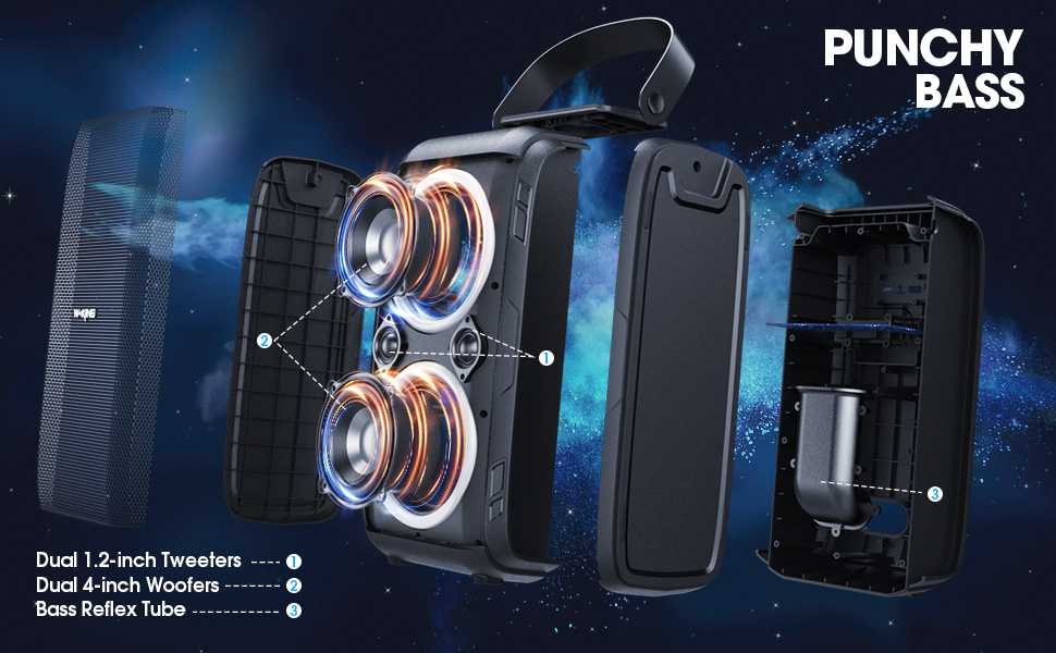 Get Loud: With 100W maximum output and 80W RMS, Omnidirectional Party Sound with integrated rear tweeter, and Bass Reflex Tube Technology Speaker for powerful bass, this Bluetooth speaker fills the room with powerful sound and deep, deep bass. 2EQ mode gives you complete control over the sound, allowing you to fine-tune the bass and mid-treble to your liking. An Incredible 105dB Huge sound is sure to astound anyone. Just everything you need to start the party.
